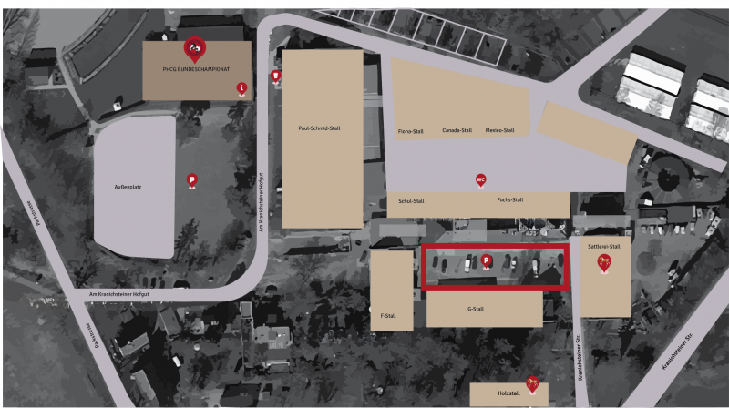 - Die Teilnehmerboxen für das Bundeschampionat 2025 befinden sich im Holzstall sowie im Sattlerei-Stall, wie im Lageplan markiert. Das Parken mit Anhänger ist